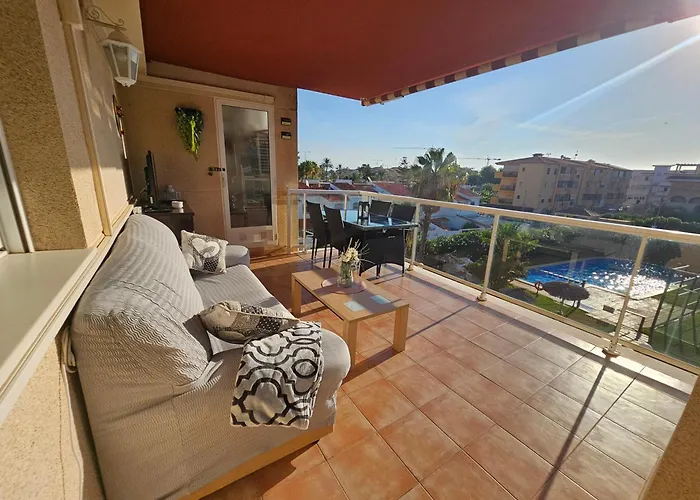 Apartament Acogedor Apartamento Con Terraza Y Vistas Al Jardin położony jest w dzielnicy Les Bovetes Beach i oferuje bezpłatny prywatny parking oraz widok na basen. 1-pokojowy apartament także oferuje rowery do wynajęcia.
